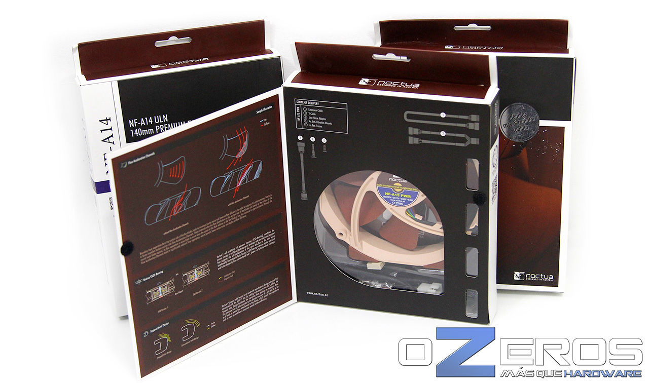 Al igual que su hermano mayor, ambos NF-A14 comparten el bundle, con tornillos, gomas anti-vibración, cables extensores, adaptadores de 3 a 4-pines y cables LNA para reducir la velocidad de rotación, la cual recordemos, en este par de ventiladores es fija por no utilizar un control de 4-pines PWM; Además, el NF-A14 FLX incorpora un cable extra, el ULNA, que baja aún más la velocidad de rotación y sonoridad, hasta límites increíbles.