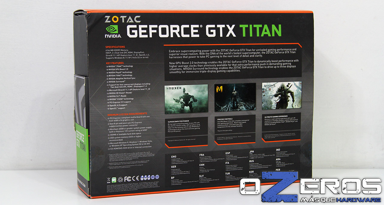 Por el reverso vienen más características técnicas en 15 idiomas, además de información de los 3 juegos que actualmente NVIDIA promociona con sus modelos GTX 600 series (más TITAN obviamente).