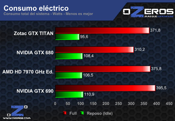 En cuanto a la competencia, el consumo de TITAN es prácticamente igual al de una HD 7970 GHz Edition, claro que estamos hablando de una tarjeta de 9 meses de antigüedad.