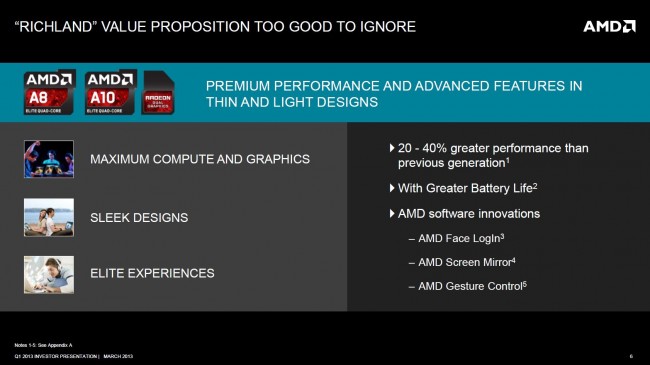 Vamos un poco más al detalle. Con Richland AMD espera hacer una transición entre su segunda generación de APUS Trinity a su 4ta generación, ya que la tercera es justamente Richland. Pero este APU, como hemos venido comentando, poco tiene de nuevo y mucho tiene de optimización de Trinity. Este chip CPU+GPU pretende hacer dos cosas importantes para el mercado al que apunta, reducir el consumo y aumentar el rendimiento, el que sería entre un 20% a un 40% mayor según AMD. Con ello los rojos esperan hacer equipos de alto rendimiento en diseños “Sleek” (algo entre delgados y elegantes), con gran duración de batería e incorporando nuevas tecnologías en software de interacción (como el control de gestos). A todo este cumulo de características AMD lo define en el rango de “Elite experiences“.