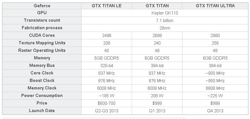 Hace tan sólo un par de meses que NVIDIA lanzó su single GPU más potente de su actual línea Kepler, la GTX Titan. Este GPU tomo el mando de la línea, y aunque no llegó a supera a la GTX 690 dual GPU, encantó por su tremendo poder gráfico encapsulado en un sólo chip. Luego vinieron los rumores de una posible GTX Titan “LE”, una versión recortada de la Titan original o mejor dicho, del GPU Gk110. Pero recordemos que la misma GTX Titan original ya cuenta con un GPU GK110 recortado, al sólo tener 15 unidades SMX (2688 CUDA cores) habilitados de las 16 de estas unidades (2880 CUDA cores), con los que cuenta en su totalidad este GPU. Pero ¿por qué NVIDIA no ha habilitado la totalidad de estos núcleos? La respuesta esta en que la cantidad de chip “buenos”, o con sus 2880 CUDA cores funcionales, aun no es tal, que permita fabricar una nueva tarjeta con ellos. Eso estaría por cambiar.
