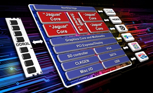 Jaguar es la evolución de Kabini bajo el proceso de construcción en 28 nm. Versus los actuales núcleos Bodcat se gana en IPC (instrucciones por segundos), mayor cantidad de núcleos (4 v/s 2)  y el paso de los 32 nm a los 28 nm. Por el lado del GPU, se deja atrás la antigua arquitectura VLIW 5 de Bodcat, pasando sobre la VLIW 4 (Trinity, Richland), y llegando a la actual GCN (Gráficos HD 7000). Como se esperaba la cantidad de núcleos SP es de 128 unidades, las cuales se dividen en 2 CU (computer unit). A diferencia de los APU Richland, que mantienen el máximo de  384 SP pero que va disminuyendo con los modelos menores, Kabini y Temash ofrecerán mismos 128 SP para todos sus GPUs integrados, sólo variando en frecuencia.  Esta arquitectura (Jaguar+GCN) la veremos transversalmente en Kabini y Temash, sólo optimizando para este último modelos de muy bajo consumo. La otra gran noticia es que estos APU serán un completo SoC, ya que integran el SB en el núcleo (Hudson FCH, “Fusion Controller Hub”).