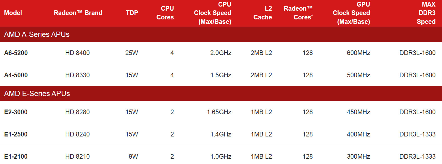 Los modelos APU Kabini que veremos en el mercado son 5 y varían de 25W a 15W, con 4 y 2 núcleos y soportando memorias de 1600MHz a 1333 MHZ DDR3L: