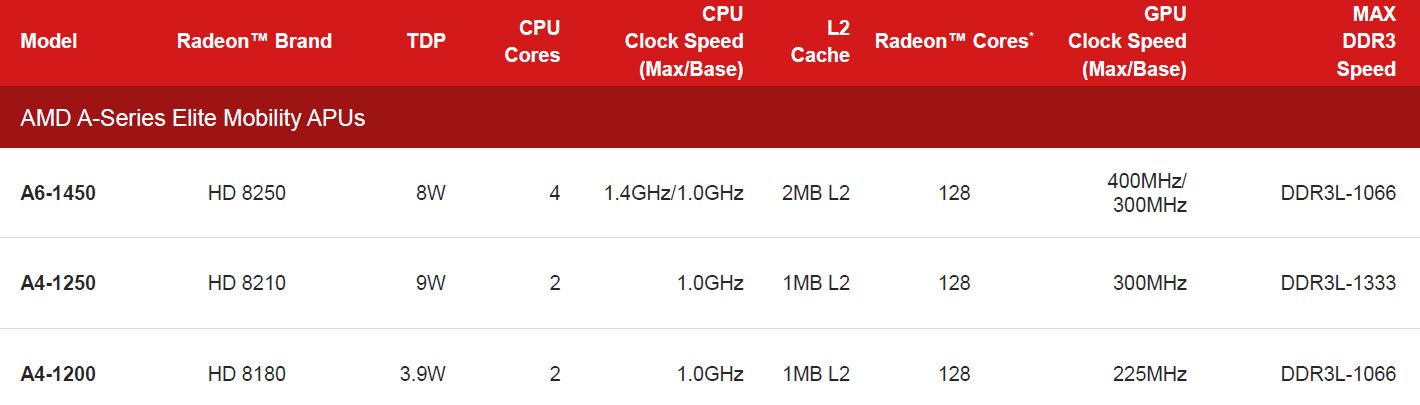 Por su parte los APU Temash serán 3 y parten desde los 3,9 W (consumo que le hace peso a chips ARM y ATOMS de Intel)  hasta modelos de 9W. Mención especial es el modelo A6-1450, el cuál es el único que posee tecnología turbo core de la serie y que le permite obtener un mejor rendimiento con un bajo consumo (8W). Este será el modelo estrella para híbridos tablets o convertibles.