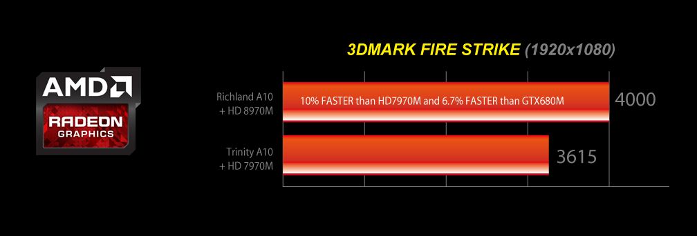 Para quienes buscan el máximo rendimiento gamer, sin gastar demás, MSI nos presenta esta opción full AMD. El GX70 estrena el nuevo APU A10 5750M con una frecuencia máxima de 3,5 GHz (2,5 GHz base), junto a la nueva Radeon HD 8970M de 2GB GDDR5. Este modelo de GPU es una HD 7970M “renombrada” (pitcairn con 1280 SP, la misma HD 7870 para desktop), pero con frecuencias mayores (aun desconocidas). Este simple cambio le da a este modelo la potencia suficiente para superar a la GTX 680M por un 6,5% (test fire Strike de 3dmark 2013) y en un 10% a la HD 7970M.