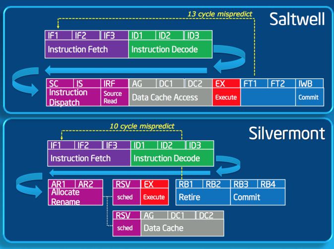 Junto con las importantes mejoras en consumo, Intel también integra mejoras en rendimiento versus “Saltwell”. Estas están dadas principalmente gracias a su característica OoOE (Out-of-Order Execution o ejecución fuera de orden), característica vista en chips actuales de alto rendimiento, tanto de Intel como AMD. OoOe básicamente hace trabajar al chip no como procesos en serie (uno tras completarse el otro), sino como procesos que internamente se desordenan para luego reorganizarse en el resultado final. En este proceso interno los procesadores aprovechan los “huecos” dejados cuando no hay información disponible para procesar un dato y pasan al siguiente que si tiene los datos necesarios. Esto resta ciclos de trabajo y por consiguiente se optimizan procesos con menores tiempos de entrega de un resultado final. De hecho Intel nos indica que Silvermont puede restarle 3 ciclos de trabajo a Saltwell.