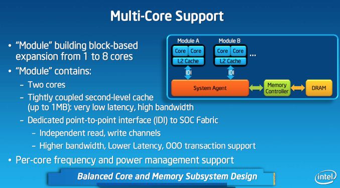 La construcción de Silvermont se basa en módulos, los que van pareados por dos núcleos en chips que pueden contener 1 ó 2 módulos llegando a combinar dos chips para crear un sistema octa-core en el mejor de los casos. Algo que no veremos en un inicio en chips para móviles, sino que seguramente en las versiones para servidores de esta arquitectura. Algo que no se menciona es si Intel le dará a a estos chips la tecnología HT (Hyper Threading), pues NO estará habilitada Esto principalmente pasa por optimizar los procesos en single thread y permitiendo que el chip pueda volver rápidamente a los estados de ahorro de energía. Simplemente el HT no ayudaba a mantener el bajo consumo que Intel necesitaba para estos chips.