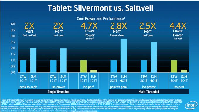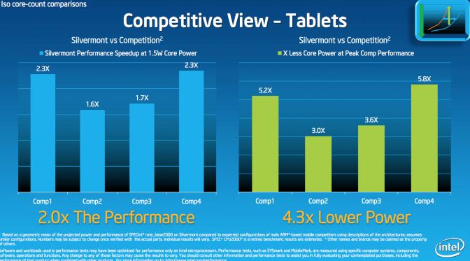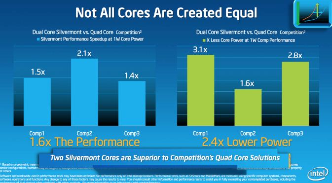 En el caso de los quad core (versiones para tablets), el rendimiento se dispara hasta 2 veces mayor que las versiones quad ARM. Por si fuera poco su consumo se logra mantener muy abajo, revelando que la inclusión de 2 núcleos extras en Intel no afecta tanto el consumo como lo es con 4 cores ARM. Como para no creerlo, aunque el papel aguanta mucho y falta hasta fines de año para ver la realidad.