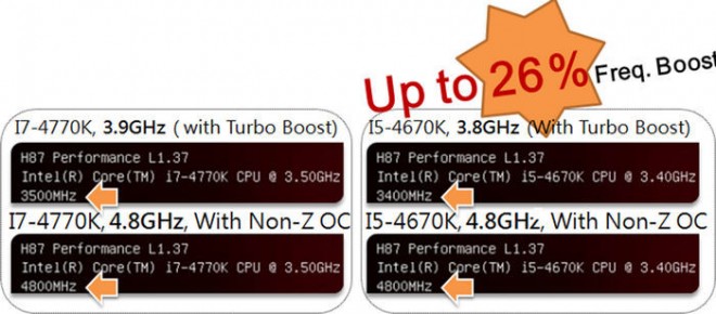 Denominada como Non-Z OC, esta opción se puede habilitar en la BIOS de placa madre Fatal1ty H87 Performance y disfrutar de hasta un 26% más de frecuencia con overclock, en un chipset H87. Non-Z OC es la opción que se aprovecha del bug y que permite el overclock en CPUs serie “K” Haswell. Por ahora, AsRock lo ofrece en la Fatal1ty H87 Performance, aunque dicho bug está presente en los chipsets H87 y B87. Con ello se puede esperar que para las demás versiones de la placa saquen las correspondientes BIOS para realizar el overclock.