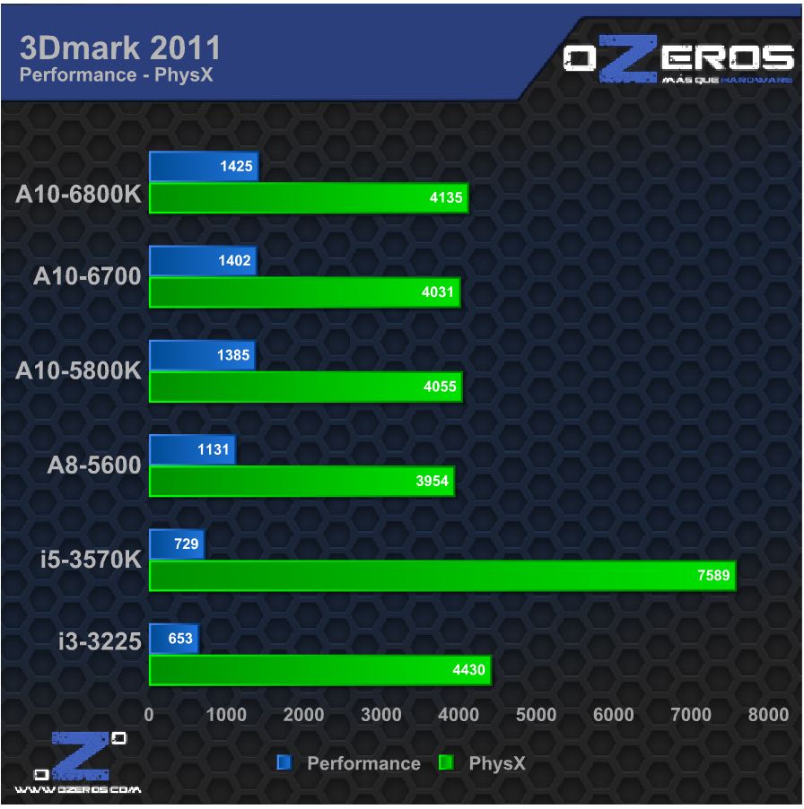 El podio en la prueba general se lo reparten en mismo orden que la anterior los APU A10, relegando a los chips del lado azul a las ultimas posiciones. Pero cuando se trata de PhysX, las cosas cambian. Intel nuevamente muestra su potencia en CPU, algo que de muy poco le vale en un test gráfico. Si AMD casi duplica en el puntaje general, Intel hace la misma gracia en PhysX.