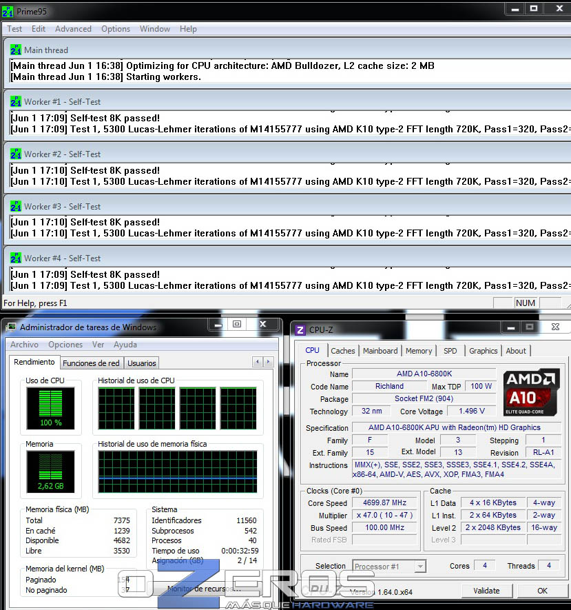 Con el modelo A10-6800K realizar overclock fue algo fácil. Con el multiplicador desbloqueado, característica que le da el plus del overclock, no fue difícil encontrar la máxima capacidad del chip y nuestra primera meta fue dar con los 4,5 GHz casi sin aumentar el voltaje. Luego abrimos Windows a 4,7 GHz y se requirió de subir los volt. Con esta frecuencia logramos superar algunas pruebas, pero cuando nos disponíamos a dejar nuestro sistema solido como la roca, Prime95 fue una barrera difícil de superar. Más estabilidad requería más voltaje y este llegó con el chip a casi 1,5v desde los originales 1,35v. Un aumento no menor, pero que, considerando la refrigeración usada, es un valor a disminuir manteniendo ese aumento de 600 MHz extras.