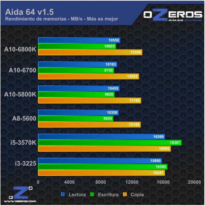 Como comentábamos, Richland tienen soporte para velocidades de hasta 2133 MHz en el caso del A10-6800K y de 1866 MHz de forma nativa para el resto de los modelos, pero como queremos equiparar y ver el resultado bruto de todos los CPUs testeados, veremos esta prueba con memorias a 1333 MHz. Como ocurría con Trinity, Richland ofrece en los test de escritura, lectura y copia números mucho más bajos que los potentes traspaso de datos entre RAM e IMC de Ivy Bridge. Veremos eso si, si en la práctica esto se cumple (juegos).