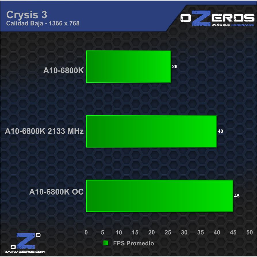 10 FPS de diferencia son un claro ejemplo de que un APU con memorias a 1333 MHz son una mala opción para sacarle buen provecho a un APU. Aquí el A10-6800K luce unos FPS extras de mejoras que el A10-5800K.