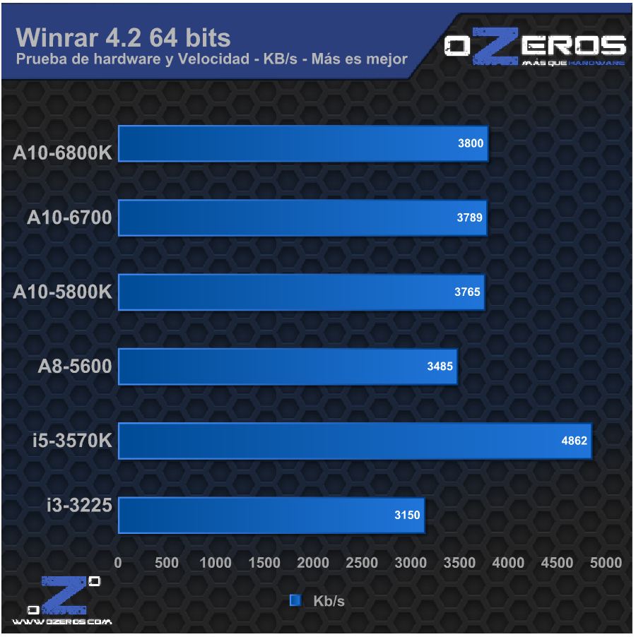 WinRar 4.2 trajo consigo mejoras en el rendimiento cuando un CPU trae más núcleos en su interior. Esto en el benchmark se traduce en hilos, o sea cuantos más hilos maneje el CPU mucho mejor rendira el test. Para Richland esto sigue siendo de poca ventaja frente a la competencia, ya que ofrece un rendimiento intermedio entre un core i3 y un core i5. Claramente el IPC (MHz v/s MHz) es el factor clave.