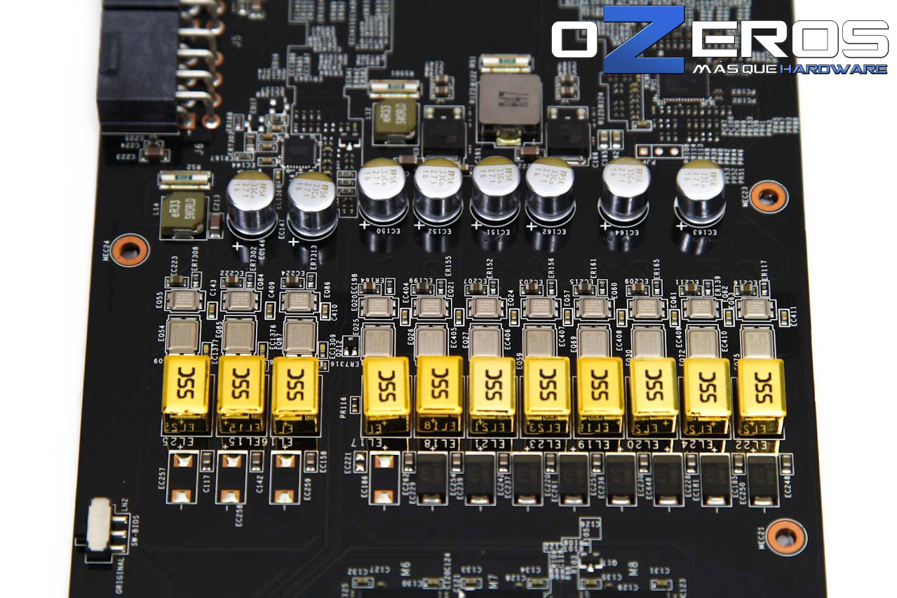 Y acáen gran sistema de fases de poder, donde podemos ver de abajo hacia arriba, una fila de unidades POSCAPs, luego estas vistosas bobinas con núcleo de ferrita SSC en color dorado, siguiendo esto tenemos unidades MOSFET’s en formato distinto al que estamos acostumbrados de ver, y finalmente tenemos los conocidos capacitores sólidos japoneses.