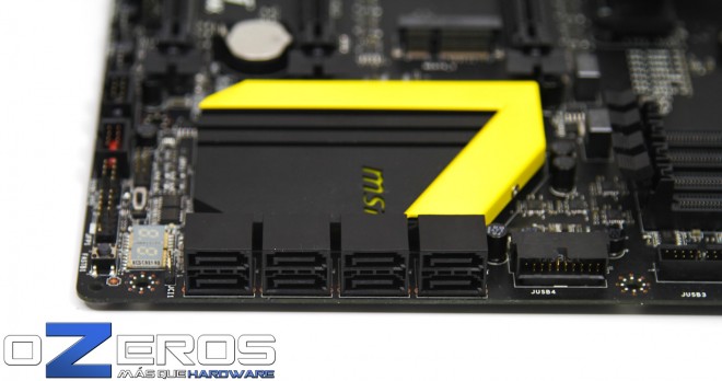 Al otro extremo de este lado tenemos los 8 puertos SATA III que se encuentran acompañados del panel LCD POST, para verificar errores y estados en la placa madre. Recordamos que el quinto puerto SATA III (de izquierda a derecha, el segundo que está abajo) queda inhabilitado si usamos el puerto mSATA con algún dispositivo de almacenamiento.
