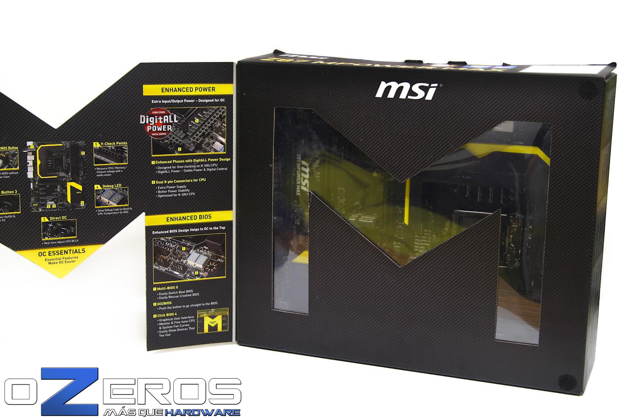Adiós a las cajas blancas y a los diseños que de forma repetitiva aparecián en todas las placas madres. La Mpower MAX se impone con una profunda caja negra y una gran “M” amarilla en el centro, que a su vez descubre una pequeña vista hacia el interior de ella. ¿Se acordaron del juego “Metro”? Nosotros también.