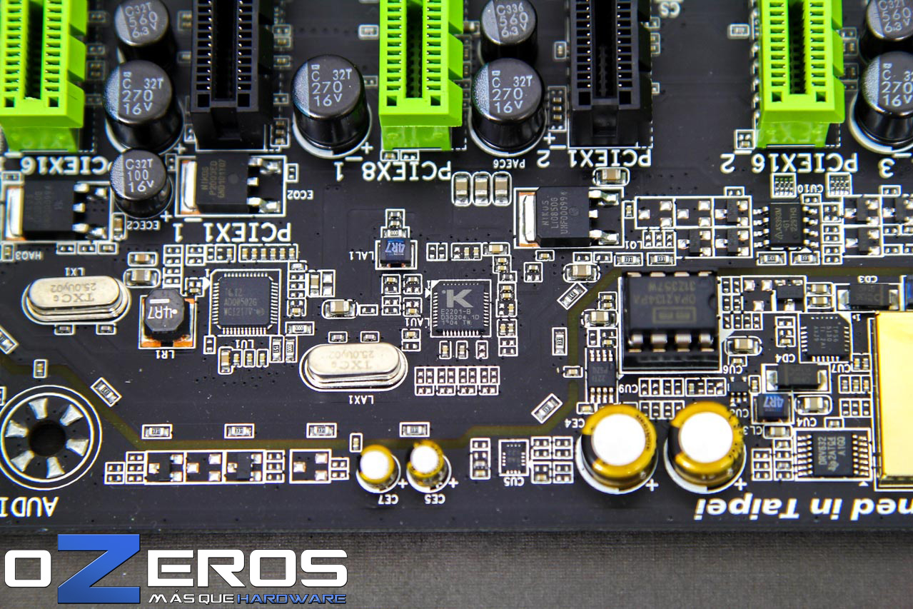 Todas las funciones de audio están a cargo de este sector de la placa madre, donde principalmente podemos ver la dorada placa protectora del chip procesador de audio Sound Core3D de Creative.