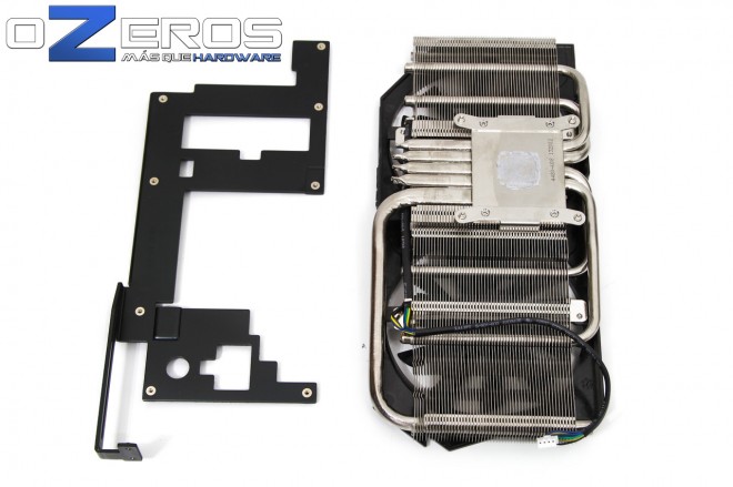 Acá tenemos el sistema TwinFrozr desmembrado, con la placa de aluminio a la izquierda de la imagen y lo demás es el disipador principal del sistema TwinFrozr de la GTX 770 Gaming.
