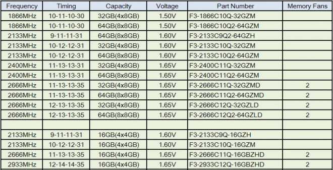 Con un IMC (integrated memory controller) mejorado con respecto a Sandy Bridge E, y heredando los buenos resultados en los chips Ivy Bridge para socket 1155, Ivy Bridge E ya puede brindar una gran capacidad en cuanto a MHz para memorias RAM DDR3. Por ello G-Skill ya cuenta con nuevos módulos que pueden exprimir las capacidades quad channel a altas velocidades en Ivy Bridge E. No son uno o dos, sino 15 nuevos modelos quad channel los que el fabricante asiático ha lanzado. Diferentes velocidades, voltajes, latencias y capacidad es lo que podemos encontrar dentro de este nutrido abanico de posibilidades en memorias RAM, pero los que más destacan son los modelos a 2666 MHz y el de 2933 MHz, este último capacitado para correr a 3000 MHz (sin ningún tipo de refrigeración exótica de por medio), en una placa madre ASUS Rampage IV Extreme y junto al nuevo core i7-4960x.