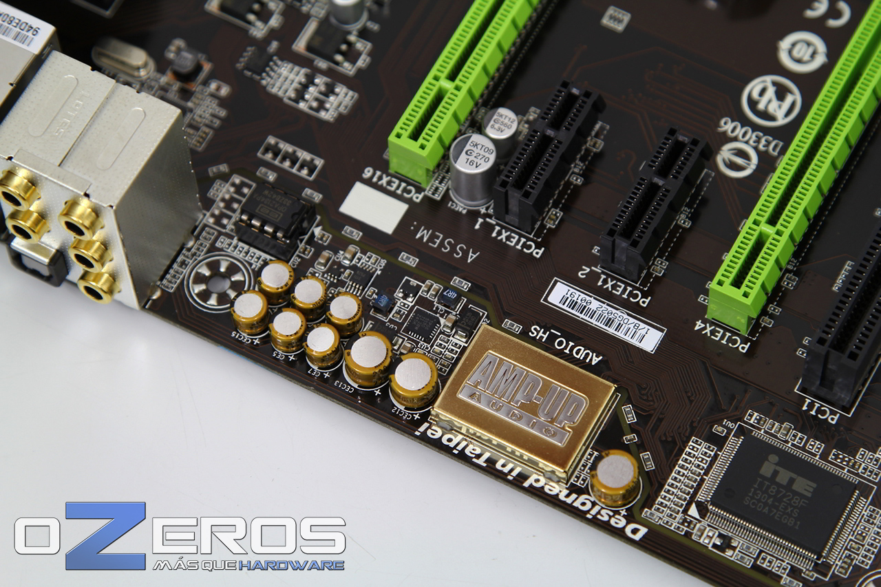 Otra de las inclusiones que la “B5” heredó de su hermana mayor es su módulo de audio separado físicamente para evitar problemas de ruido en el sonido. Esto se puede ver por medio del camino de luz verde que se extiende en uno de los extremos del PCB. Además, el sistema de audio se complementa con condensadores sólidos de grado audiófilo marca Nichicon y el CODEC de audio Realtek ALC898, algo antiguo para estos tiempos. De todas formas, con estas configuración se logra un nivel SNR de 110 dBA.