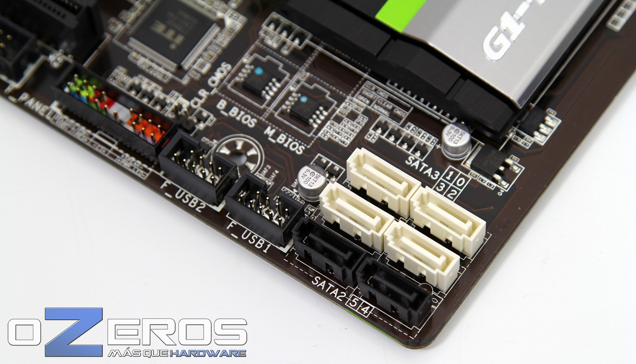 El panel I/O de la G1.Sniper B5 cuenta con lo justo y necesario para definirse como una placa madre versátil y hasta gamer; Puertos PS/2 para una mejor respuesta en periféricos de juegos, cuatro puertos USB 2.0 y otro par 3.0, salida de video HDMI, conectores de audio de 3,5 milímetros cubiertos en oro y las salidas S/PDIF coaxial y óptica, todo para audio. Finalmente cerramos el conteo de puertos con el infaltable LAN Rj-45, en este caso GigaLan) para conectividad y redes.