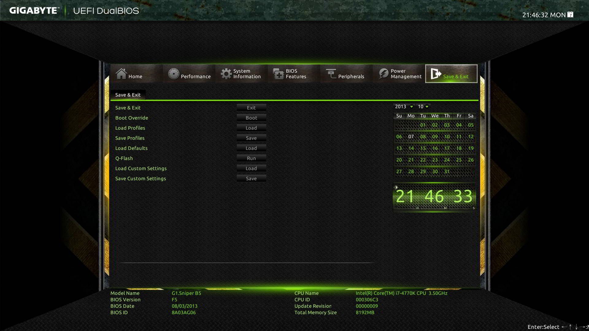 Finalmente nos vamos retirando de la BIOS en la G1.Sniper B5 para encontrarnos con el estándar de toda buena placa actual: Un buen puñado de perfiles para guardar y cargar, además de una utilidad integrada a la BIOS que nos sirve para actualizar, es muy sencillo: Dejan la BIOS que quieran instalar en un flashdrive en formato FAT, entran a la BIOS, inician la utilidad Q-Flash – que pueden ver en la última imagen – y navegan su unidad de almacenamiento hasta encontrar la BIOS deseada. Aceptas un par de botones y luego de un par de minutos el PC se reiniciará solo, eso es todo, tu BIOS quedó actualizada.