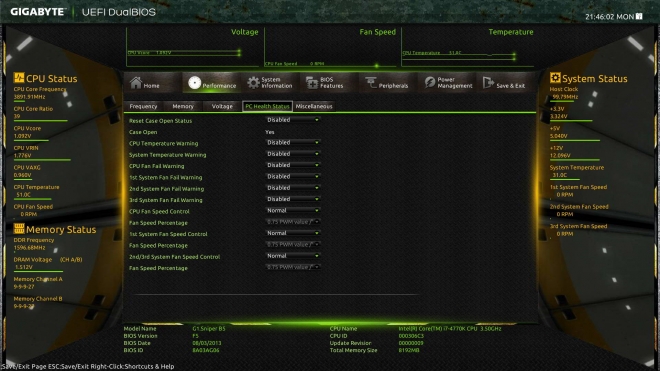 Siguiendo en el menú “Performance” nos encontramos con la pestaña “PC Health Status”, donde tenemos todos los parámetros configurables para ajustar alertas de temperatura, apertura del gabinete, ventiladores, etc etc.