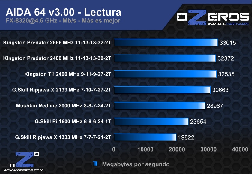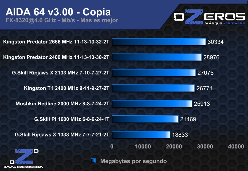 En el caso de las Predator a 2400 MHz, obtienen un buen resultado dentro de la media de la prueba, siendo mermadas un poco por sus latencias como en benchmarks anteriores; En cambio a 2666 MHz son las únicas que logran superar la barrera de los 9 Mb/s, resultado realmente impresionante, sobre todo si consideramos que se encuentran casi 2 Mb/s por encima del kit más lento, el cual cuenta con la mitad de la frecuencia de trabajo.