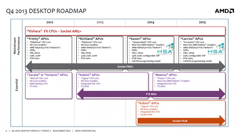 Es habitual que los planes de “papel” de AMD se vean frustrados conforme pasa el tiempo, por ello esta noticia no nos sorprendería que pasará para el próximo año. Según nuevas filtraciones, el roadmap de arquitecturas y lanzamientos APU de AMD se vería algo modificado para el 2015, fecha para la cual se esperaba que los rojos pusieran en marcha la producción de chips bajo 20nm. Ahora parece que no serà asi.