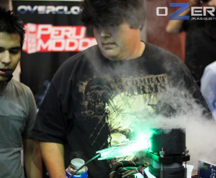 Luego comenzaron los chicos de Peru Modding con la demostración de overclock extremo con nitrógeno líquido. No nos pregunten como lo hicieron, pero estos muchachos estaban equipados con un contenedor de 250 litros de liquido destructor de máquinas exterminadoras del futuro.