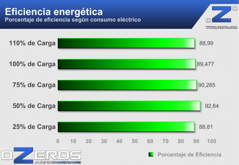 El fabricante, nos indica que la fuente de poder cuenta con la certificación 80 plus gold, la cual indica que la fuente de poder debería de tener una eficiencia mínima de 88% al 20 y 100% de carga, y una eficiencia del 92% al 50% de carga
