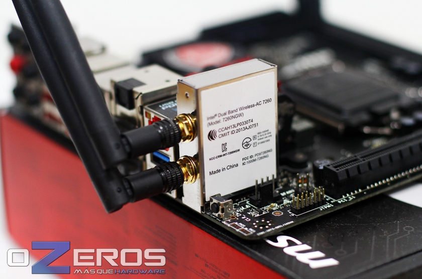 Pensado en su uso netamente doméstico o fuera de nuestros escritorios, como estamos acostumbrados, la MSI Z97I Gaming AC cuenta con un nuevo módulo para redes inalámbricas apoyado por el controlador Intel Dual Band Wireless-AC 7260, modelo 7260NGW. Este chip nos entrega soporte tanto para la conectividad Bluetooth 4,0, como para el nuevo estándar Wi-Fi AC.