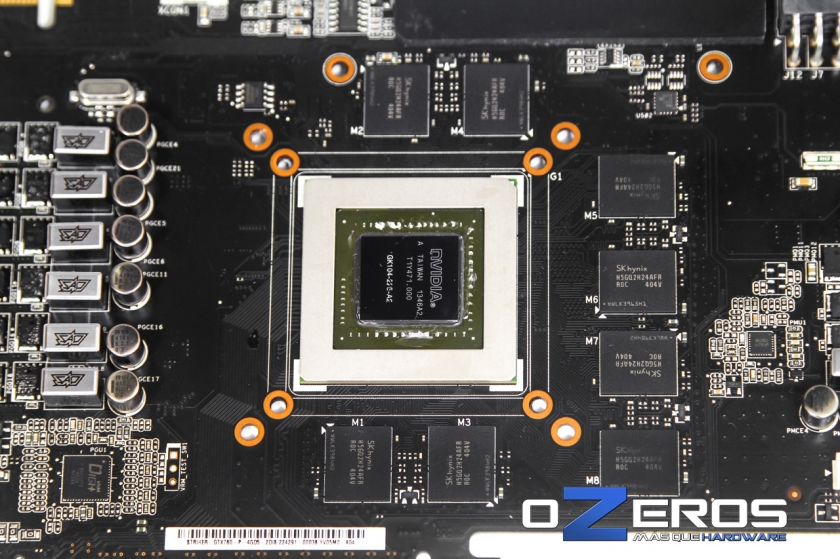 Volviendo a lo que era el frontis del PCB, lo que más nos extraña es ver un GPU GK104 girado en 90° respecto a la horizontal, algo bastante raro y que pocas veces se ve en tarjetas NVIDIA. De todas formas lo que tenemos en frente es el GK104-225-A2, el mismo GPU visto en la GTX 760 referencial que pudimos ver tiempo atrás, sólo que este chip fue elegido “con pinzas” según nos comentan desde ASUS.