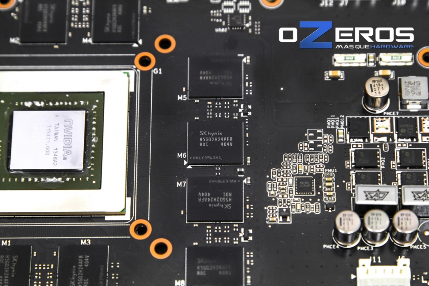 Los chips de memoria elegidos para este modelo son los H5GQH24AFR, fabricados por SKHynix, los que están concebidos para trabajar a 1500 MHz nominales, 6000 MHz GDDR5 efectivos. A diferencia de otros módulos vistos en revisiones anteriores, los que equipan la GTX 760 Striker no tienen mucho rango de overclock según el fabricante debido al volumen que se empleó en ellos: 4 GB de memoria versus 2GB de la referencial.