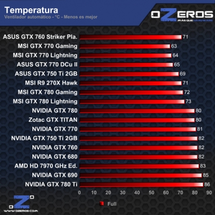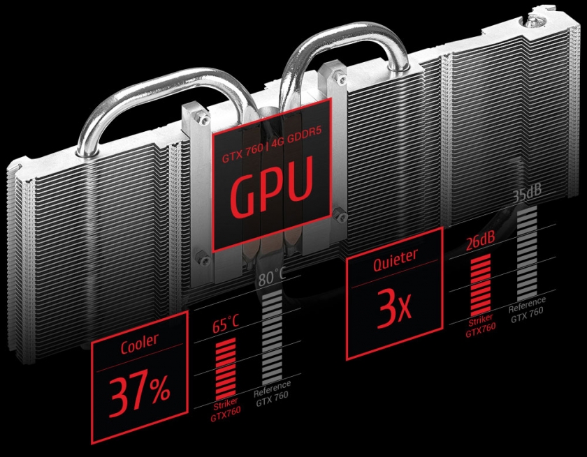 En resumidas cuentas, el sistema DirectCU II de la ASUS GTX 760 Striker Platinum logra una temperatura hasta un 37% menor y 3 veces menos ruidosa que el diseño referencial.