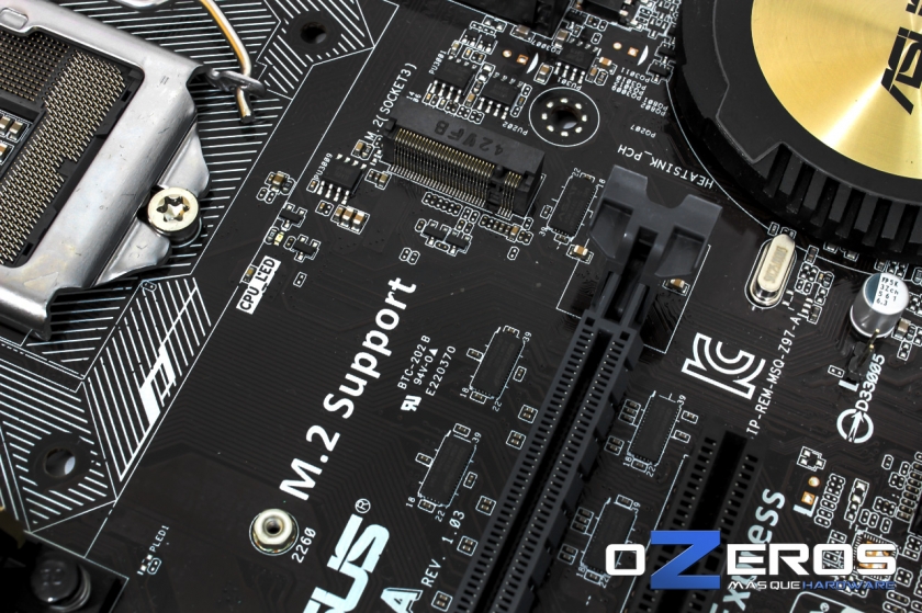 Y he aquí una de las nuevas adiciones para Z97, el soporte oficial de SSDs M2. Este se encuentra ubicado entre el socket del procesador y el primer slot PCI-E.