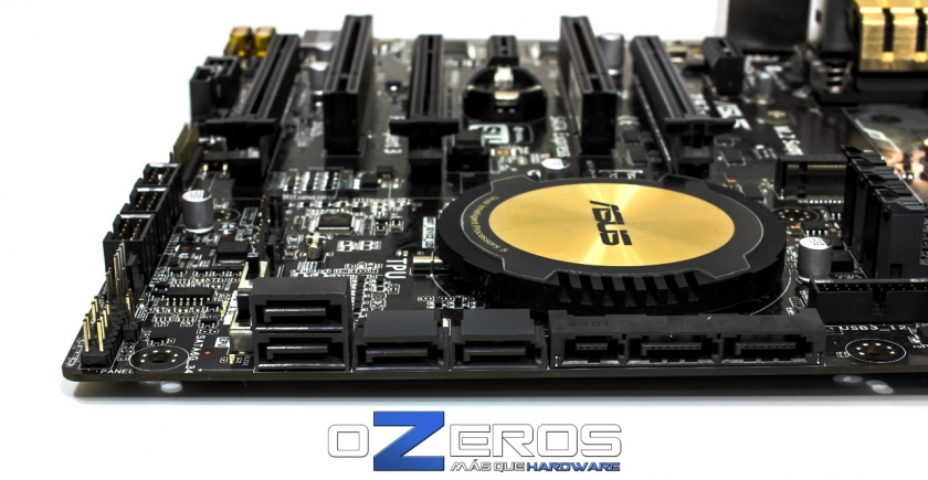 Podemos ver en esta imagen las 8 fases digitales DIGI+ Power Control que nos entrega ASUS para esta placa. También podemos notar los bellos disipadores de color dorado que si bien son algo simples, cumplen con su trabajo. Cabe señalar que debajo de el disipador superior, se encuentra el segundo procesador de la tecnología Dual Intelligent Processors 5, EPU, el cual se encarga del manejo de la eficiencia energética.