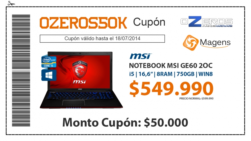 OZeros y la tienda de tecnología Magens se ha unido para darle una promoción exclusiva para todos los fans y seguidores de oZeros donde contarán con un cupón de descuento especial por la compra de un Notebook Gamer MSI GE60 20C tendrás $50.000 pesos de descuento.