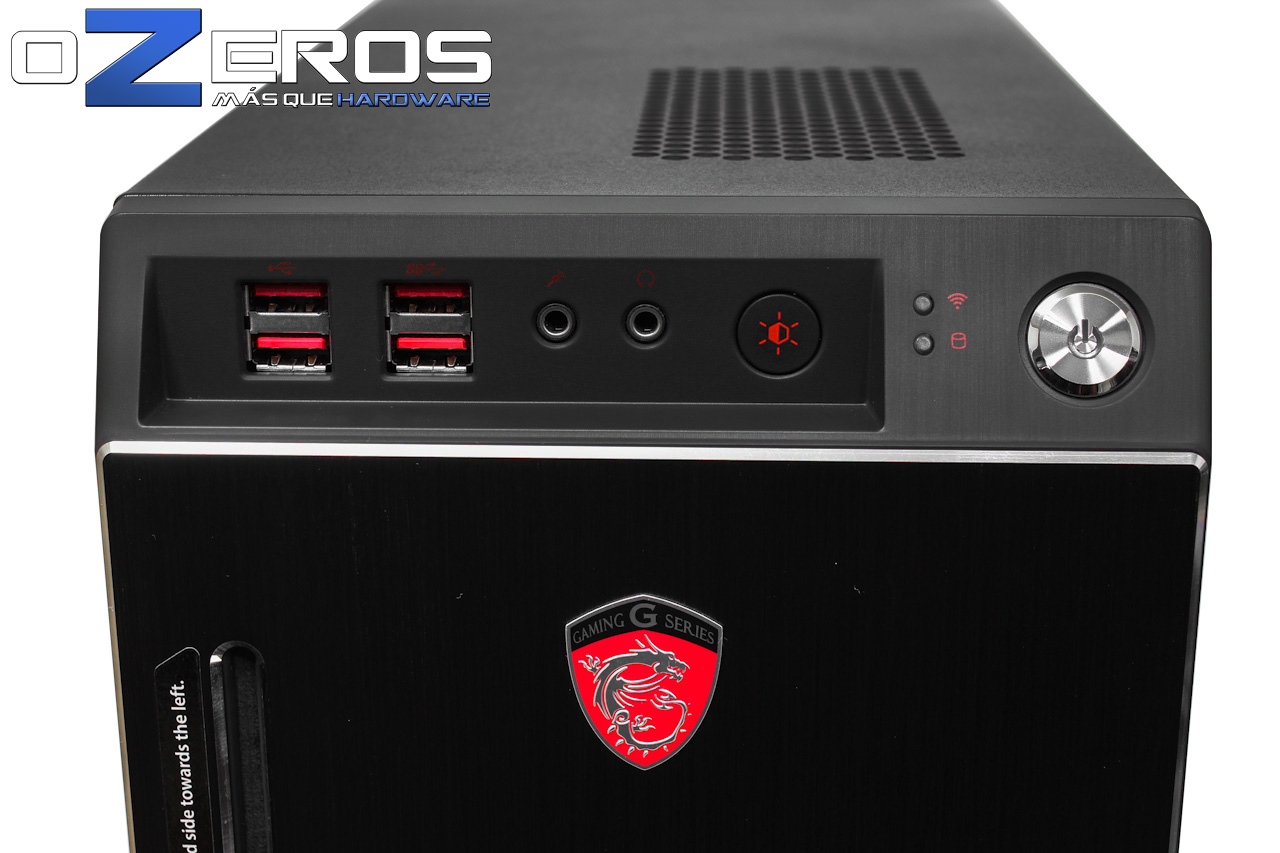 Su frontis es de aluminio cepillado y anonizado en color negro. Además vemos el logo de la Gaming Series de MSI en una placa metálica y en relieve.