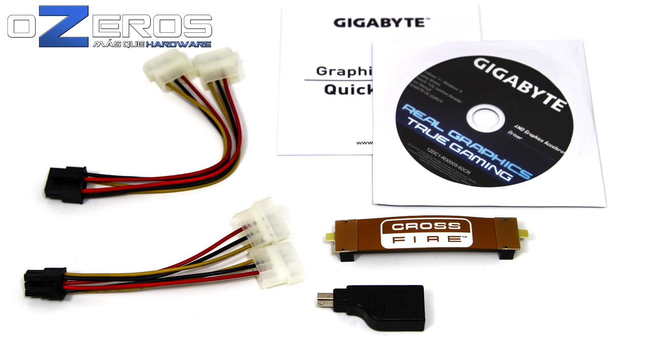 El nutrido set de accesorios de compone de disco de drivers y utilidades, un puente CrossFire flexible, cables adaptadores de poder para transformar puertos Molex (4 pines) a dos puertos PEG de 6 y 8 pines respectivamente. Finalmente encontramos un adaptador mini DisplayPort a DisplayPort en formato normal.
