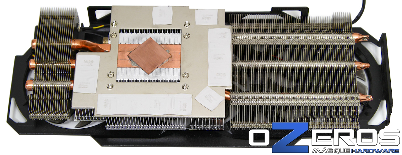 Lo que también podemos apreciar en la imagen anterior lo vemos algo más en detalle en la siguiente fotografía: Un soporte y a la vez disipador que sostiene un pequeño disipador para las fases de poder el cual podremos ver más adelante. Por otro lado y cerrando esta revisión visual podemos ver tres de los heatpipes de 6 mm saliendo a través de la densa área de aletas.