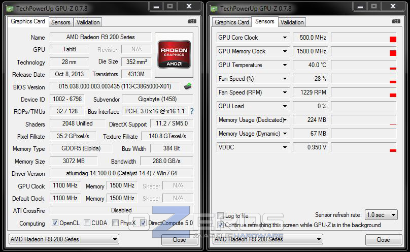El controlador de voltajes de la R9 280X de Gigabyte está acargo del chip ADP4101, un chip poco usado en el medio que es capaz de controlar hasta 6 fases de poder y ofrece control de voltaje “on the fly” desde 0,375 hasta 1,6V, claro que desactivando todas las protecciones con que toda tarjeta cuenta. Su nivel de control y monitoreo es menor, cosa que podremos ver en la siguiente página, en la captura de GPU-Z.
