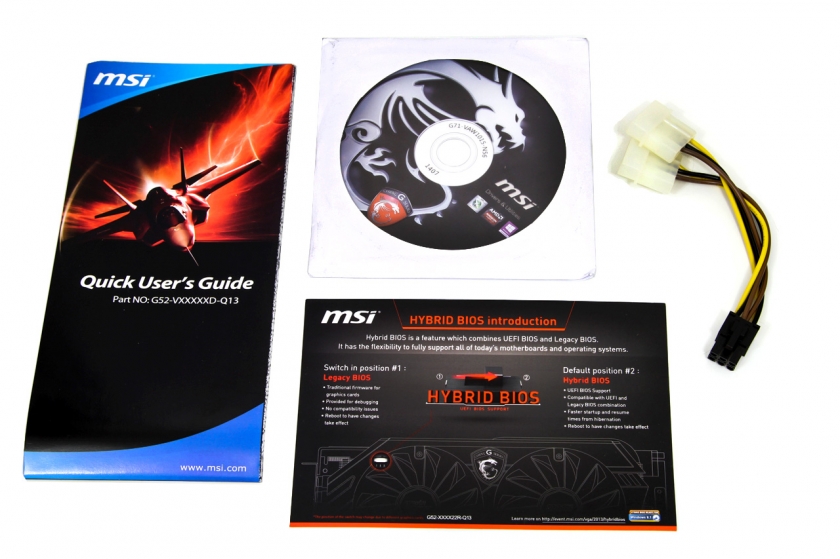 El set de accesorios es bastante escueto aunque cumple con lo justo y necesario para hacer funcionar esta tarjeta: Manual de usuario y folleto con explicación del sistema “Hybrid BIOS”, disco con drivers y utilidades, y finalmente un cable adaptador de poder que va desde dos conectores para periféricos de 4 pines (erróneamente conocidos como “Molex”) hacia un conector PEG – PCI Express – de 6 pines. Este cable adaptador sólo servirá si nuestra fuente viene, por lo menos, con un conector PEG de 8 pines.