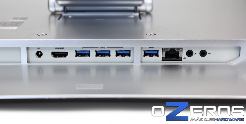 La conectividad es este equipo es muy buena, pero tiene un detalle. Está equipado de 4 puertos USB 3.0 traseros, LAN y audio, pero estas están en la parte trasera y ubicado debajo de la pata que sostiene el All in One. Además su orientación es vertical hacia abajo y esto hace que sea muy difícil conectar dispositivos como pendrives o similares. Si bien tiene 2 puertos laterales, estos son USB 2.0 y al menos nosotros los utilizamos para el teclado y mouse dejándonos sólo la posibilidad de conectar por atrás.