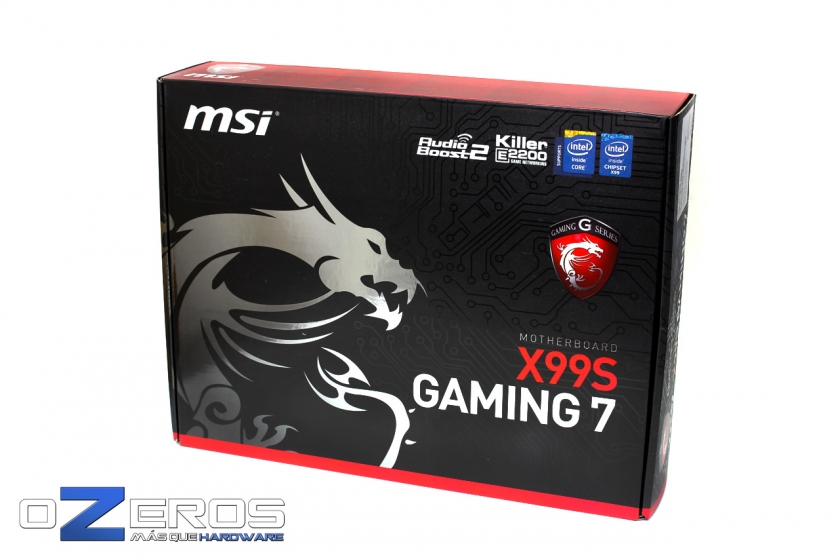 Comenzamos con el embalaje de la MSI X99S Gaming 7. En su frontis podemos ver el diseño característico de la Gaming Series con la combinación de colores en negro y rojo. Además tenemos el logo del Dragón que caracteriza esta serie, el nombre y modelo de la placa madre y algunos de sus componentes principales como la Red con chip Killer e2200, Audio Boost 2 y su chipset X99.