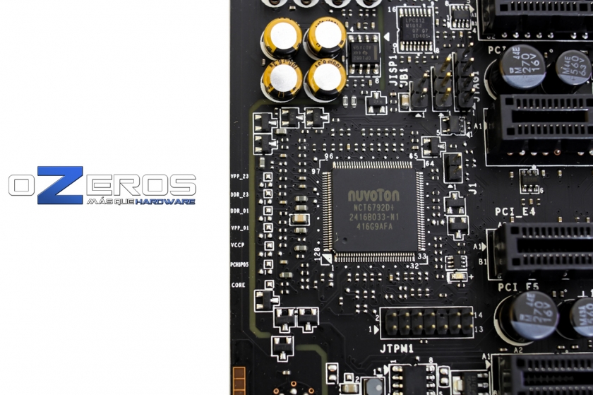 Luego, tenemos el chip Nuvoton NCT6792, encargado de las funciones Super I/O. En este caso, encargado de controlar el puerto PS/2 y de monitorear temperaturas y velocidades de los ventiladores.