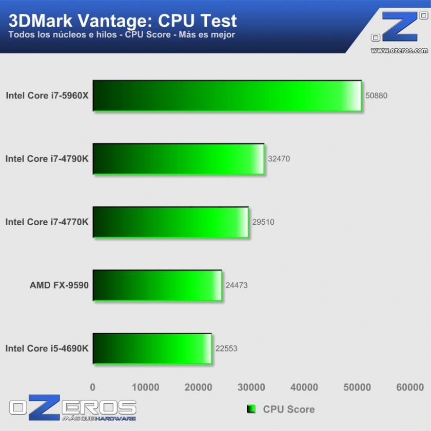 Con 50.880 puntos nuevamente el 5960X se hace con el primer puesto de esta prueba muy lejos de su más cercano competidor. Cabe destacar que en esta prueba se dublica el rendimiento del AMD FX-9590 con facilidad y sucede casi lo mismo con el 4770K.