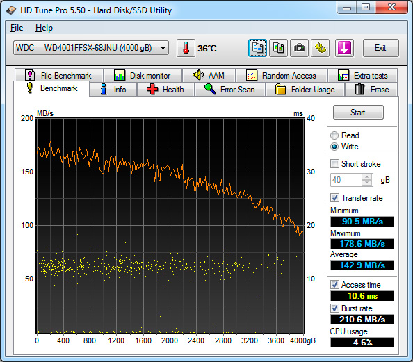 La prueba de lectura nuevamente fue notables. El WD Red PRO logró un promedio de 145,5 MB/s, con un máximo de 183,8 MB/s en el sector más rápido del disco y de 91,6 MB/s en el sector más lento. Siendo un disco de 4TB estos rresultados son realmente impresionantes, tanto así que debemos decir que es el disco mecánico más rápido que hemos probado.