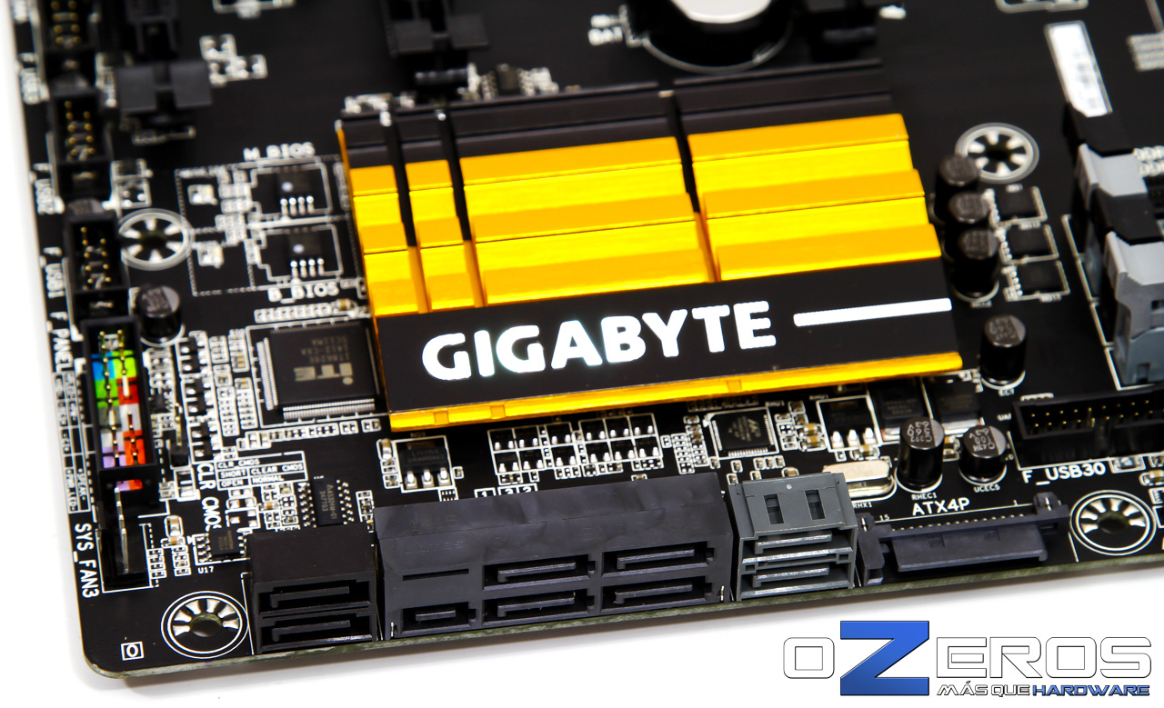 Siguiendo por los bordes de la Z97X-UD7 TH, nos encontramos con los puertos de almacenamiento. Esta cuenta con ocho puertos SATA 6Gbps o seis puertos SATA 6Gbps y un puerto SATA Express. Ademas, tenemos el conector ATX4P el cual es el encargado de entregarle energía directa a los puertos PCIe para cuando se utilicen configuraciones multi-GPU.
